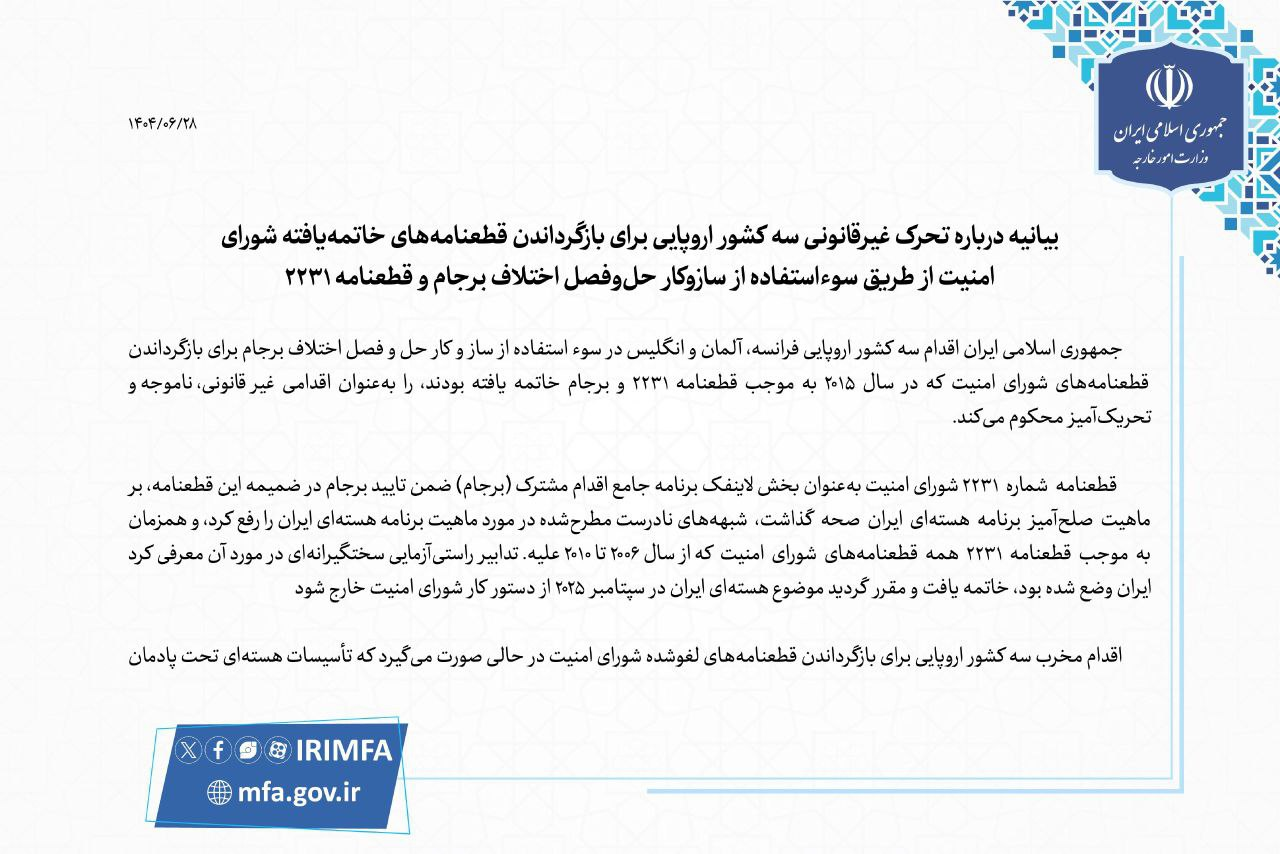 بیانیه وزارت امور خارجه جمهوری اسلامی ایران درباره اقدام غیرقانونی سه کشور اروپایی